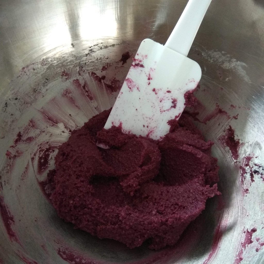 1. Place the processed mixture in a bowl and add 55 g of egg whites. Using a spatula, mix all of it into a smooth paste. Don’t rush it, be patient, mix it really well. The final paste is compact, sticky but smooth. If you want to colour your macarons, now it’s the time. Stir food colouring into the paste, but remember that the final colour will be much lighter after you add the meringue.