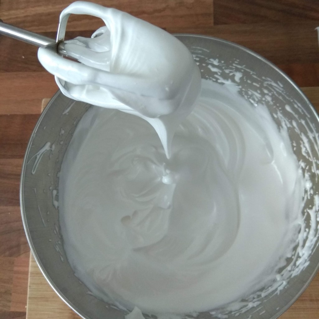 1. Simultaneously with the syrup getting warmer, start whipping your egg whites – the time depends on the strenght of your mixer. I normally start whipping when the syrup starts bubbling. Use a low speed to avoid too many bubbles in the meringue.
