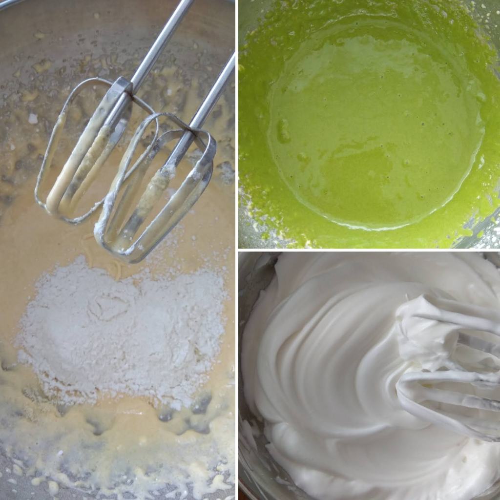 - With a spatula, gently and carefully combine the two mixtures together. The result will be a light green colour batter. Pour the batter into the cake form, even the surface and place in the preheated oven.