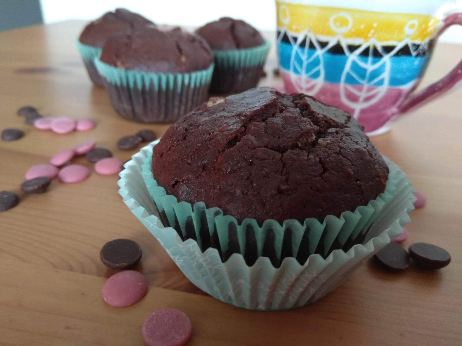 So I came up with this recipe for chocolate chip muffins. I call them triple chocolate because they contain cocoa and then dark chocolate chips and ruby chocolate chips. Ruby chocolate is quite new and it’s really delicious, but don’t worry if you don’t have it, you can simply use white or milk chocolate. Or any kind of chocolate you prefer.